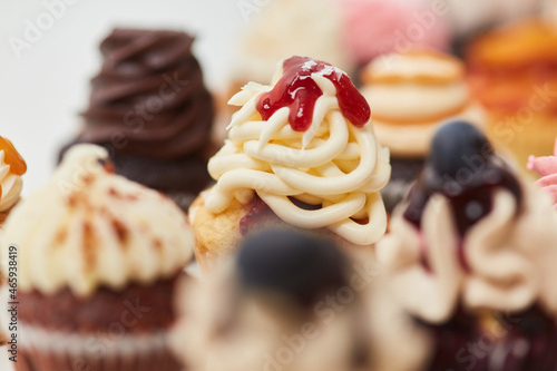 Viele sortierte bunte Cupcakes von oben mit Toppings