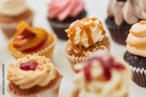 Viele sortierte bunte Cupcakes von oben mit Toppings