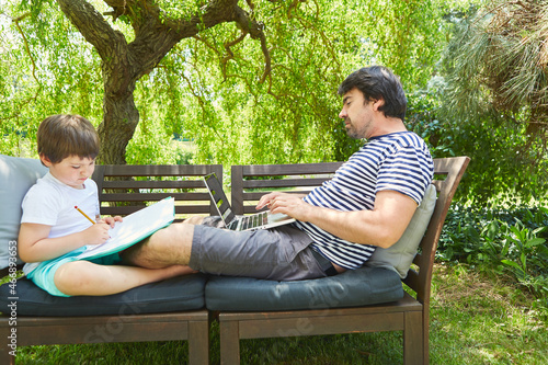 Alleinerziehender Vater am Laptop PC auf der Terrasse