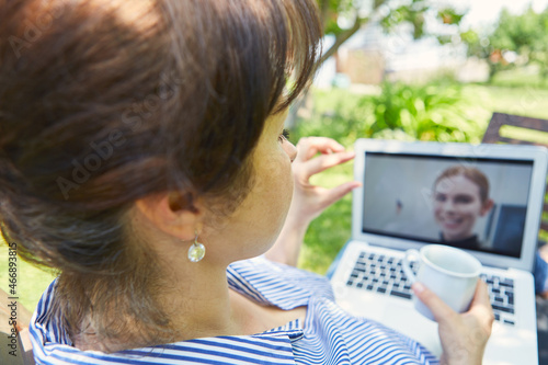 Kind nervt alleinerziehende Mutter am Laptop im Garten