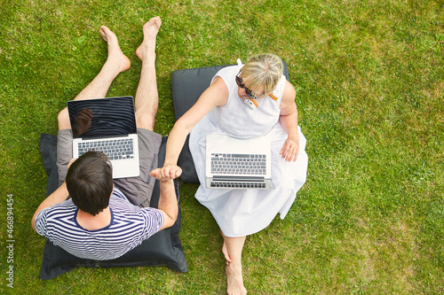 Freelancer couple working on laptop computer in the garden