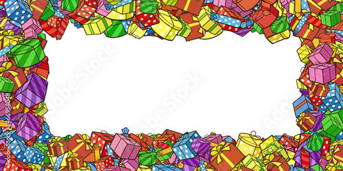 Viele bunte Geschenke als Rahmen um Textfreiraum