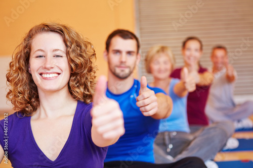 Frau im Fitnesskurs hält Daumen hoch