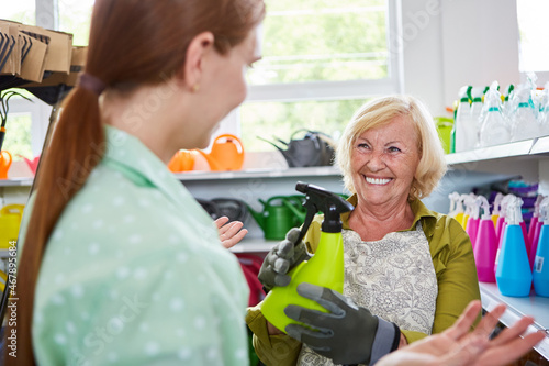 Floristin als Verkäuferin im Gartencenter mit Kundin