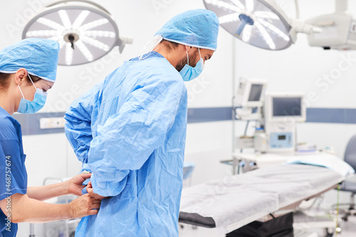 Krankenschwester hilft Chirurg beim Kittel anziehen