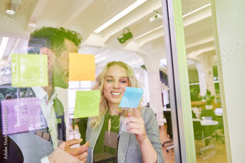 Geschäftsmann klebt Zettel auf Glaswand