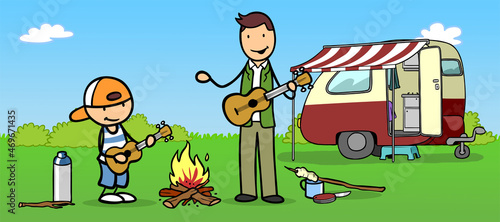 Vater und Sohn am Lagerfeuer beim Camping mit Gitarre