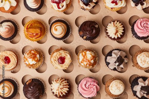 Viele sortierte bunte Cupcakes von oben mit Toppings