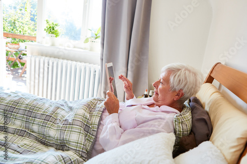 Kranke Seniorin im Bett im Altersheim beim Videochat