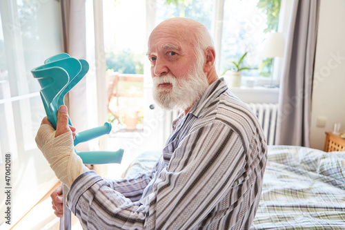 Senior mit Handgelenksbruch und Gehhilfe in Klinik