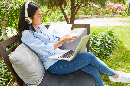 Frau als Influencer oder Freelancer am Laptop im Garten