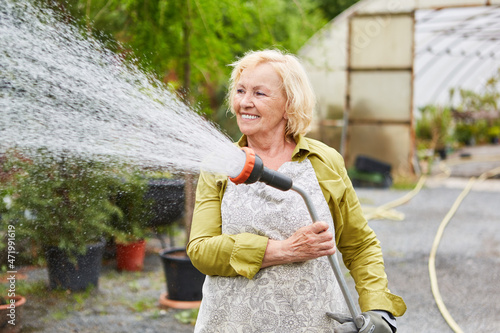 Ältere Gärtnerin beim Blumen wässern mit einer Brause