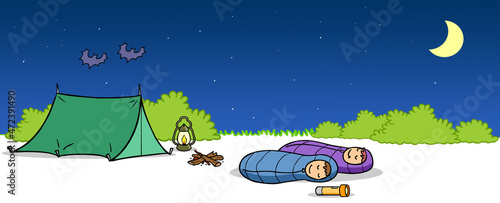 Paar beim Schlafen in Schlafsack vor Zelt nachts