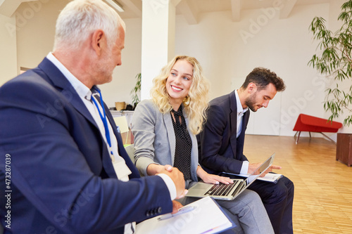 Geschäftsmann gratuliert Referentin mit einem Handschlag