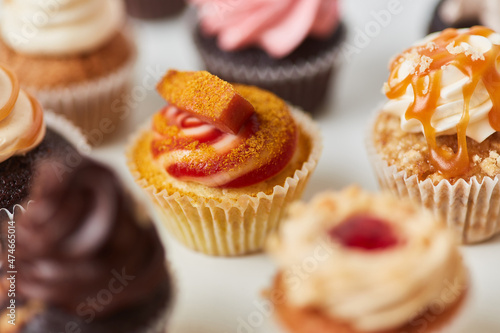 Viele sortierte bunte Cupcakes von oben mit Toppings