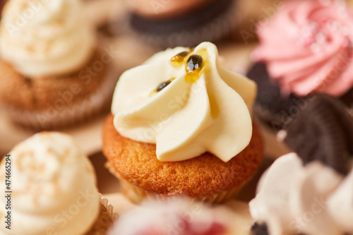 Kleiner Cupcake mit Sahne und Maracujacreme als Topping