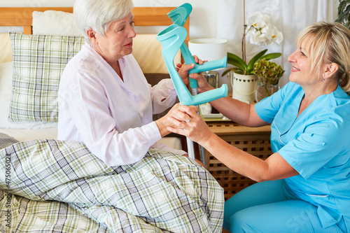 Altenpflegerin hilft Seniorin beim Hausschuhe anziehen