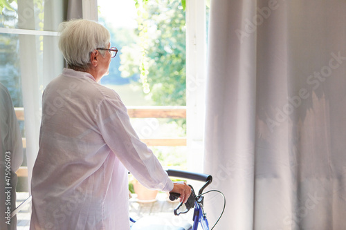 Senior as a patient with walking aid looks out of the window