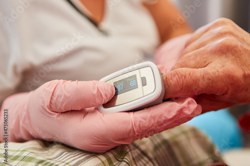 Krankenschwester misst Blutdruck am Finger vom Senior
