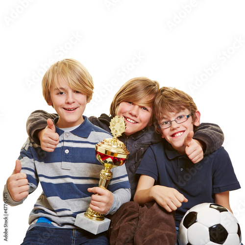 Jungs mit Pokal und Fußball halten Daumen hoch