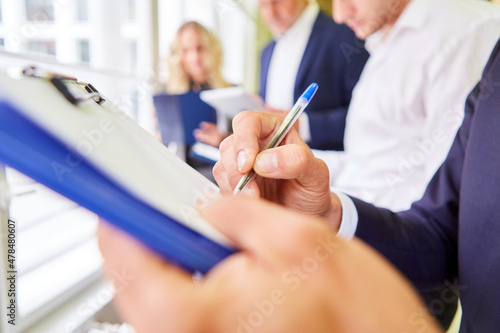 Hand mit Stift sucht in vielen Business Portraits nach richtiger Bewerbung