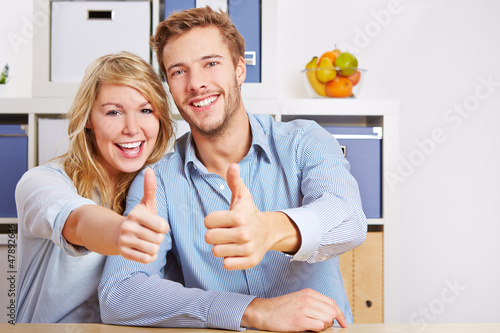 Paar im Wohnzimmer hält Daumen hoch