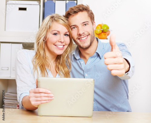 Paar mit Tablet Computer hält Daumen hoch