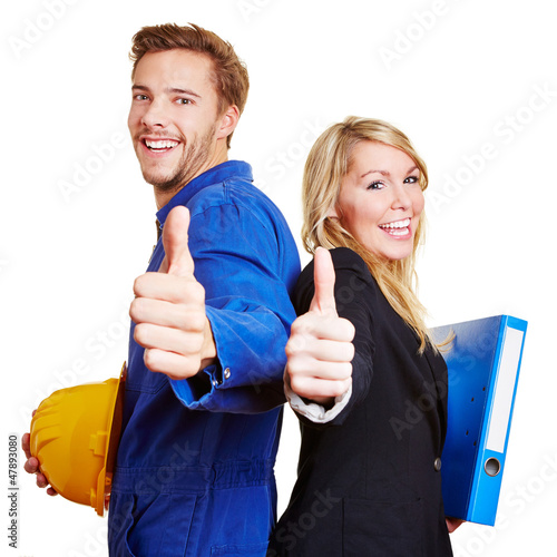 Handwerker und Geschäftsfrau halten Daumen hoch