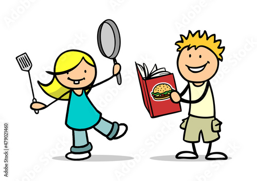 Fröhliche Kinder schlagen einfaches Essen in Kochbuch nach