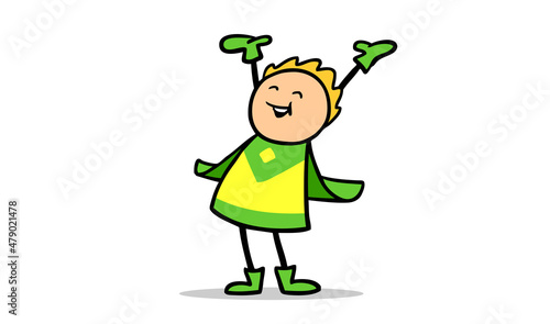 Junge im Superhelden Kostüm zeigt stolz seine Muskeln