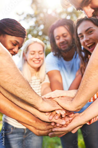 Freunde stapeln Hände als Symbol für Gemeinschaft