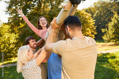 Gruppe junger Leute trägt und hebt eine junge Frau