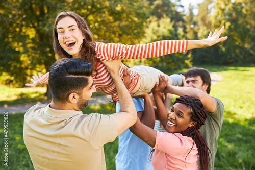 Gruppe Freunde hebt gemeinsam Frau für Teambuilding