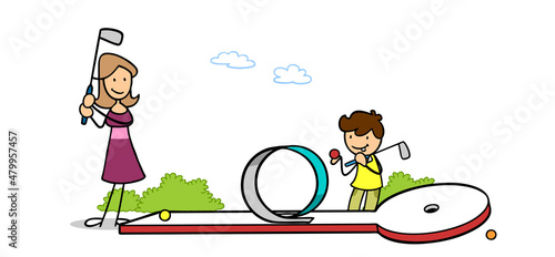 Kind jubelt beim Minigolf beim Spiel mit Freund