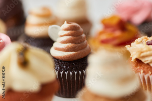 Viele sortierte bunte Cupcakes von oben mit Toppings