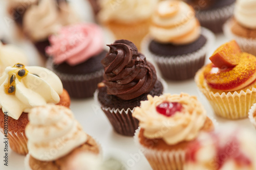 Viele sortierte bunte Cupcakes von oben mit Toppings
