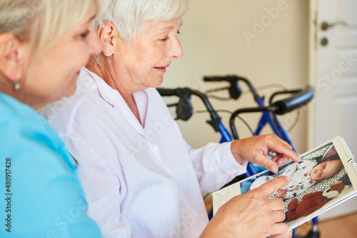 Seniorin zeigt Altenpflegerin Fotos von Enkeltochter