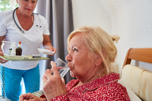 Kranke Seniorin nimmt Medikamente ein mit Glas Wasser