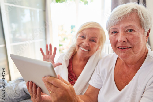 Seniorin winkt glücklich in die Webcam am Tablet Computer