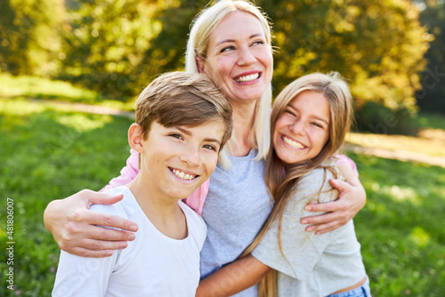 Glückliche Mutter umarmt liebevoll ihre Kinder