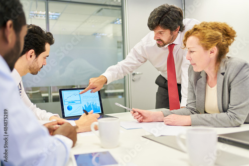 Geschäftsleute zeigen mit Händen auf Statistik Daten