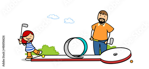 Tochter und Vater spielen zusammen Minigolf