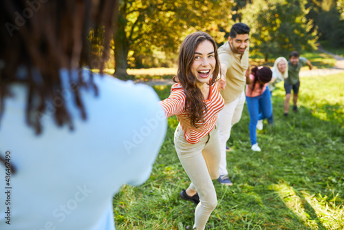 Fröhliche junge Frau und ihre Freunde Hand in Hand