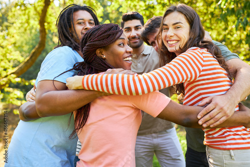 Multikulturelles Start-Up Team umarmt sich im Workshop