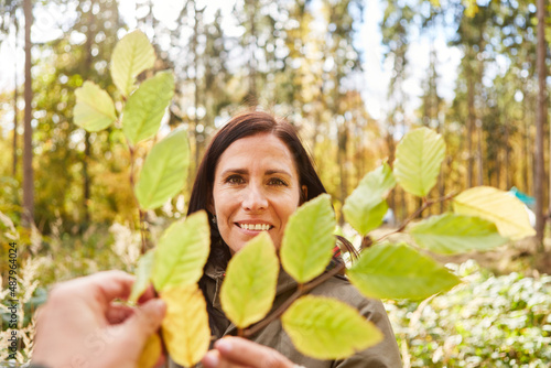 Frau schaut auf Blätter bei der Baumbestimmung im Wald