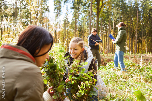 Junge betrachtet neugierig Pflanzen im Wald bei Waldführung