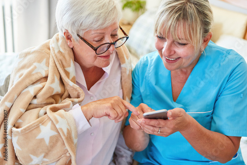 Geriatric nurse explains the app on the smartphone to a senior citizen