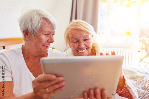 Seniorin winkt glücklich in die Webcam am Tablet Computer