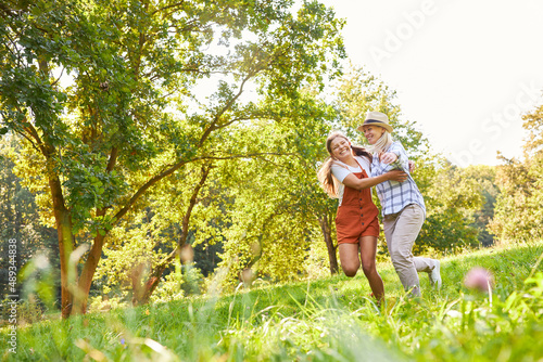 Mutter läuft mit ihrer Tochter über eine grüne Wiese