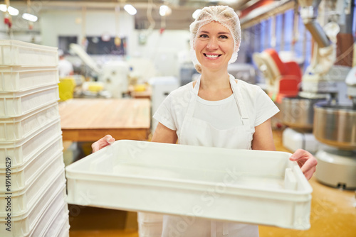 Bäcker Lehrling in der Ausbildung trägt eine leere Kiste